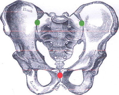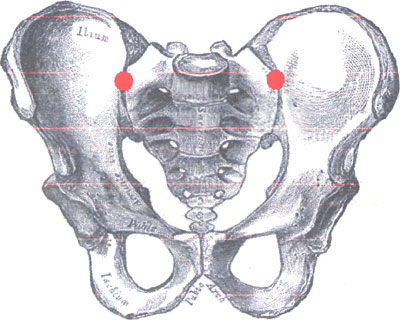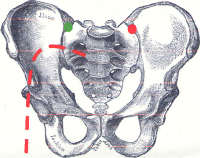 IPO bilaterale della sacro-iliache porterà ad avere un'attitudine nella quale la linea P.A. andrà a cadere sulle teste femorali, questo genera forti dolori inguinali ma senza la presenza di una coxartrosi.  |